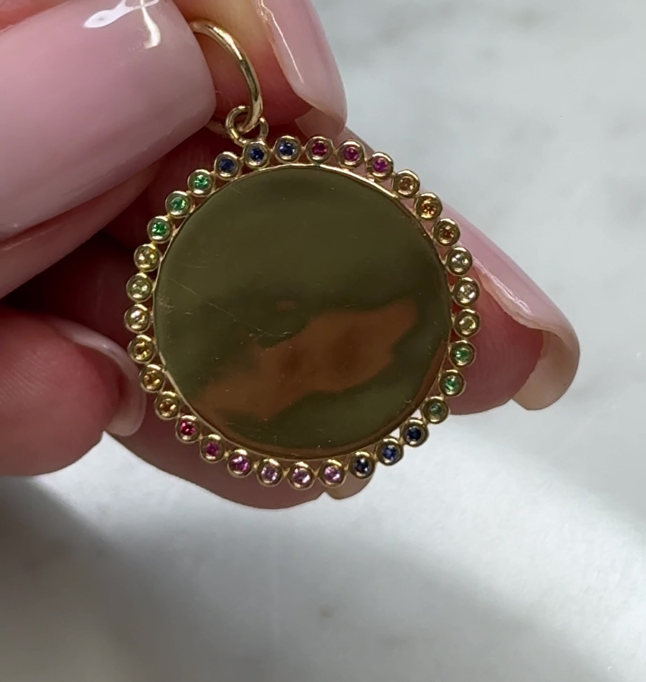 Add a pop of color to any outfit with our 14K Sapphire Rainbow Disc Charm. Made with genuine sapphires, this charm will catch all the right attention. Perfect for the playful and stylish fashionista!